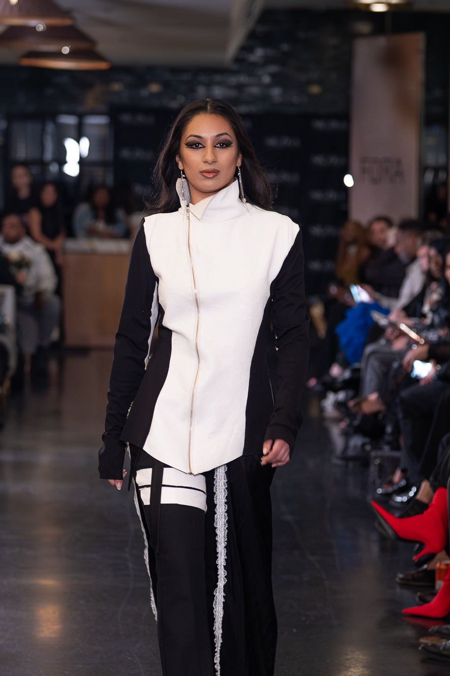 Lambskin leather jacket with black stretch paneling. Features adjustable side seam zippers.
