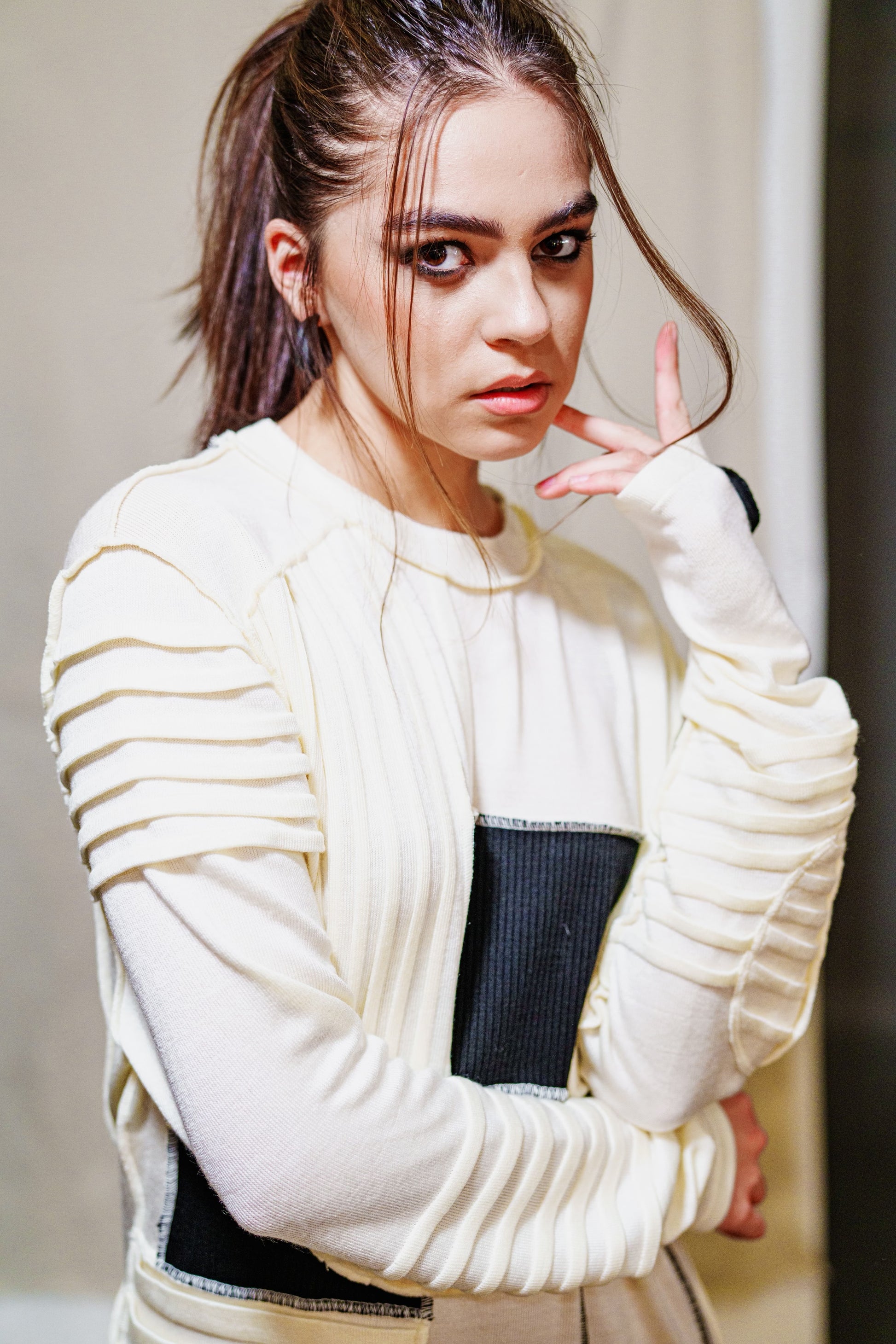 The pullover is made with an asymmetric patch pattern. Suitable for combining with different pants and jeans.