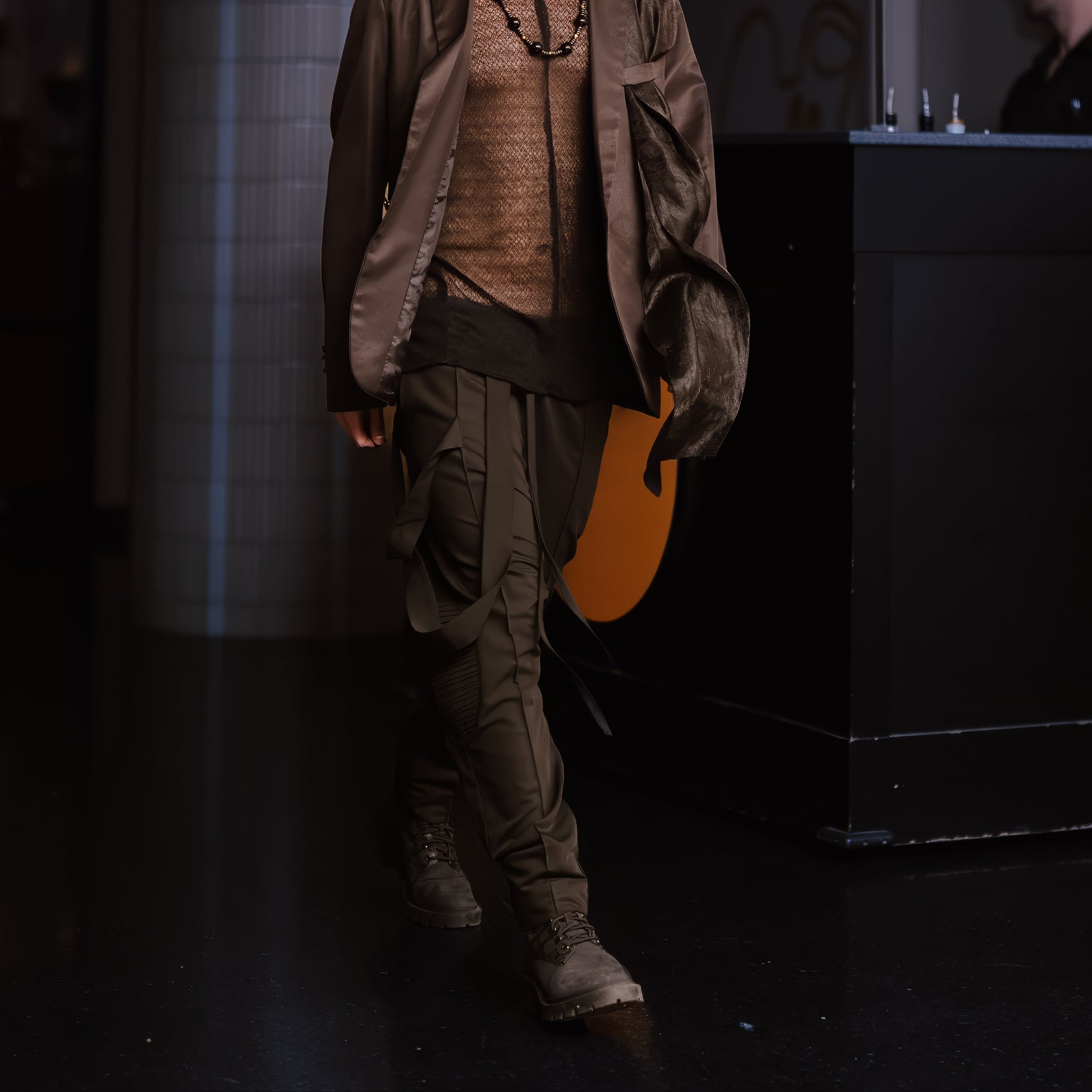 Jogger pants featuring cargo pockets, side panels, and draped straps.