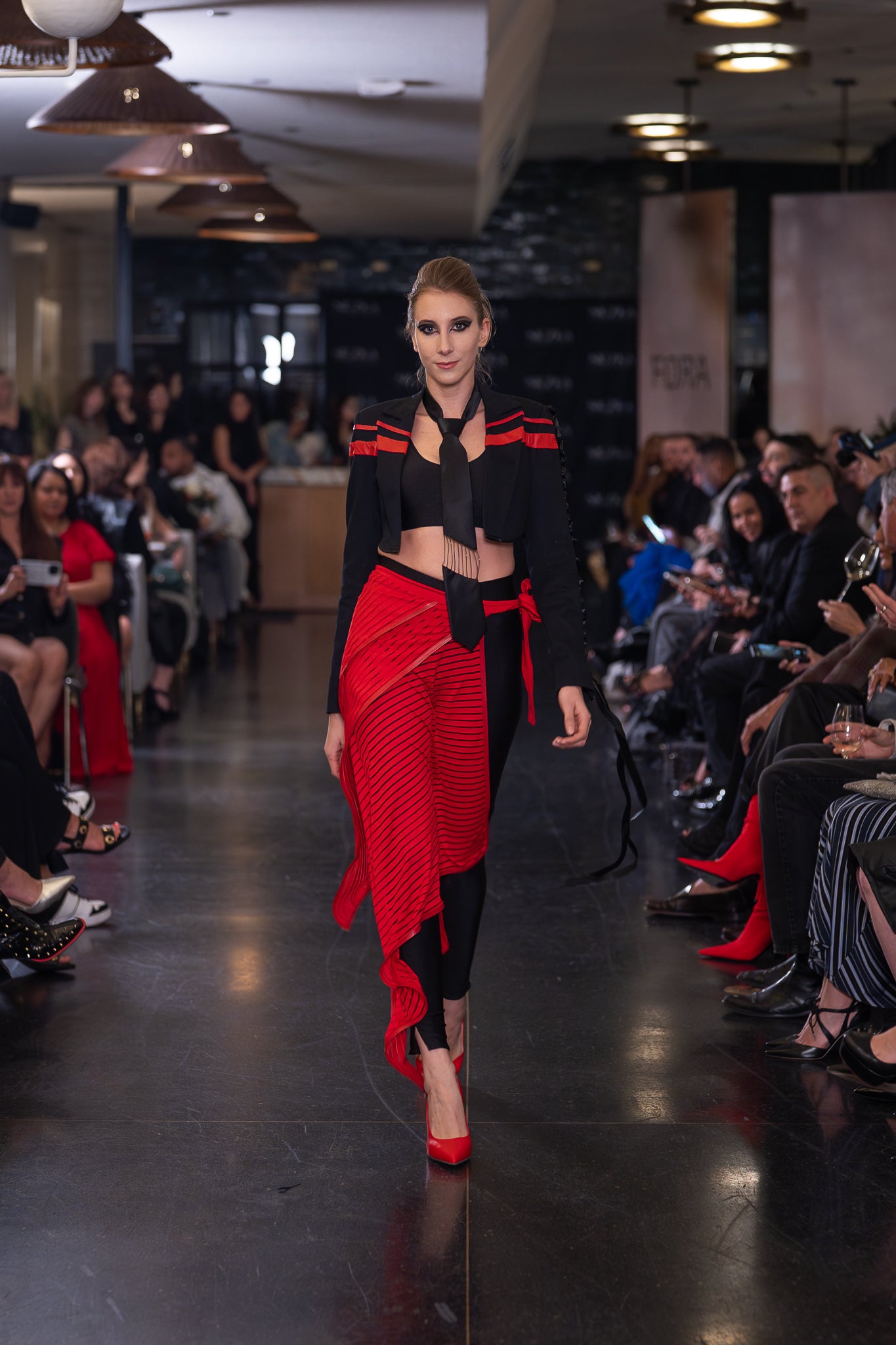 Tired wrap skirt in a mesh striped fabric. Includes red leather trim around the edges.