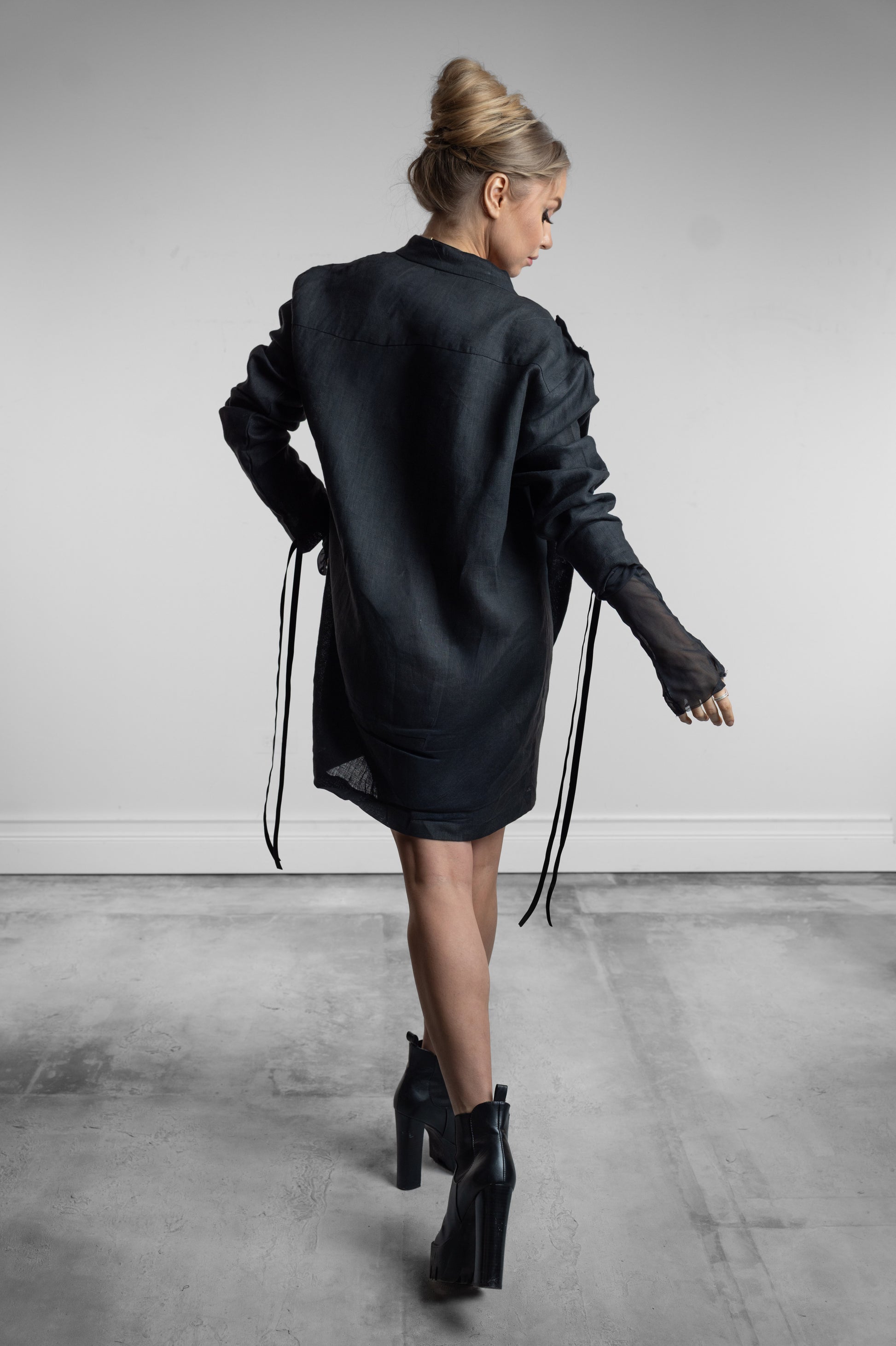 A modern, elongated kaftan crafted in a soft matte black for a clean, architectural line that moves effortlessly across genders.