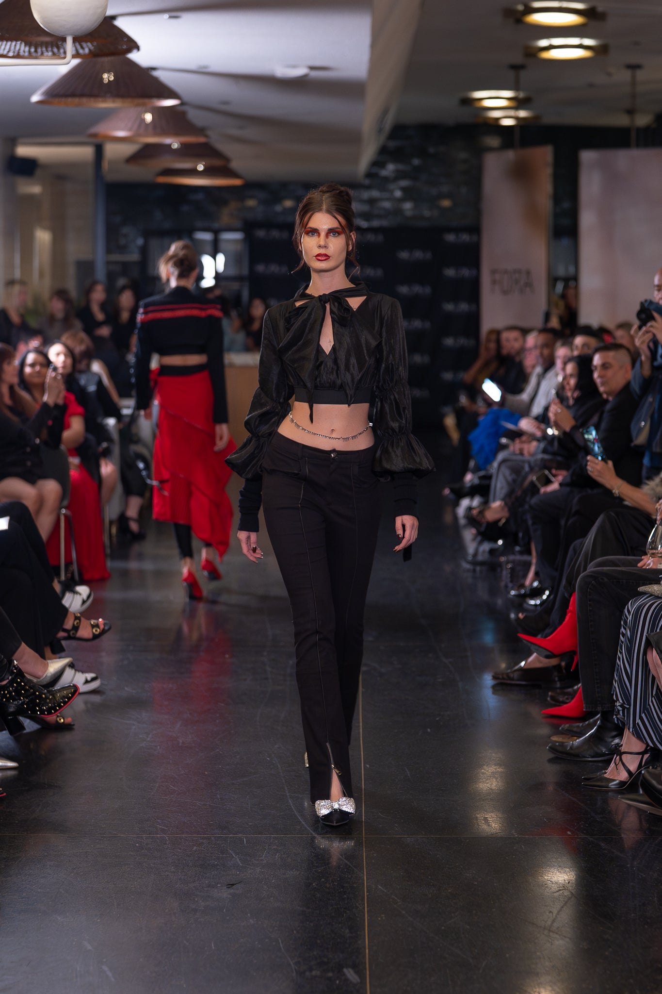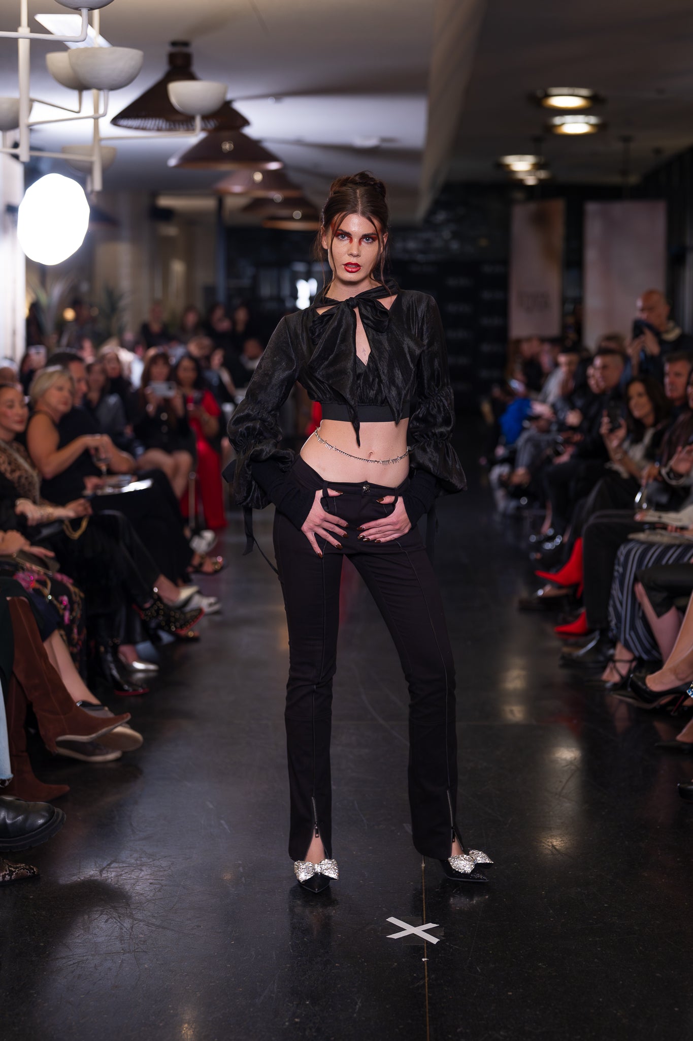 Mid-rise straight pants with front piping down the middle of the pant legs that blends into ankle zippers. Features dainty gold chains down the back of the pant legs.
