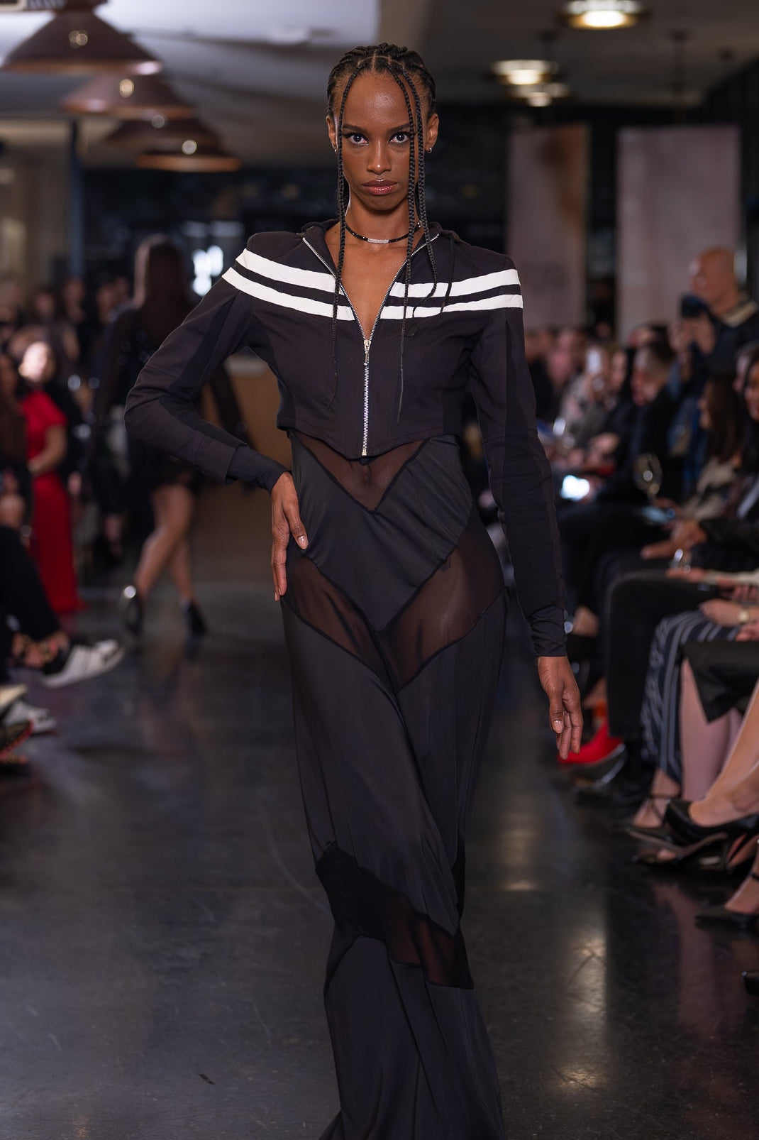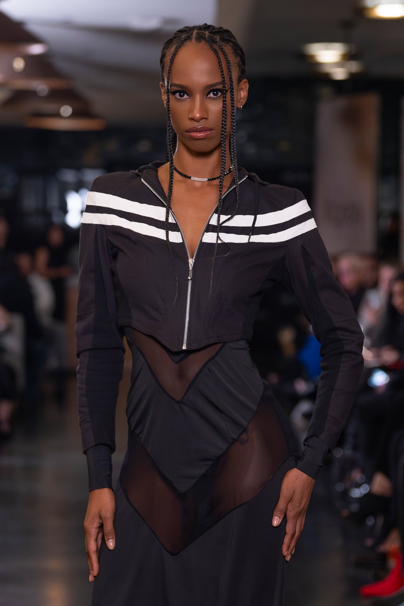 Cropped front zip jacket with black paneling. Features white leather stripe detailing with a v-hemline.