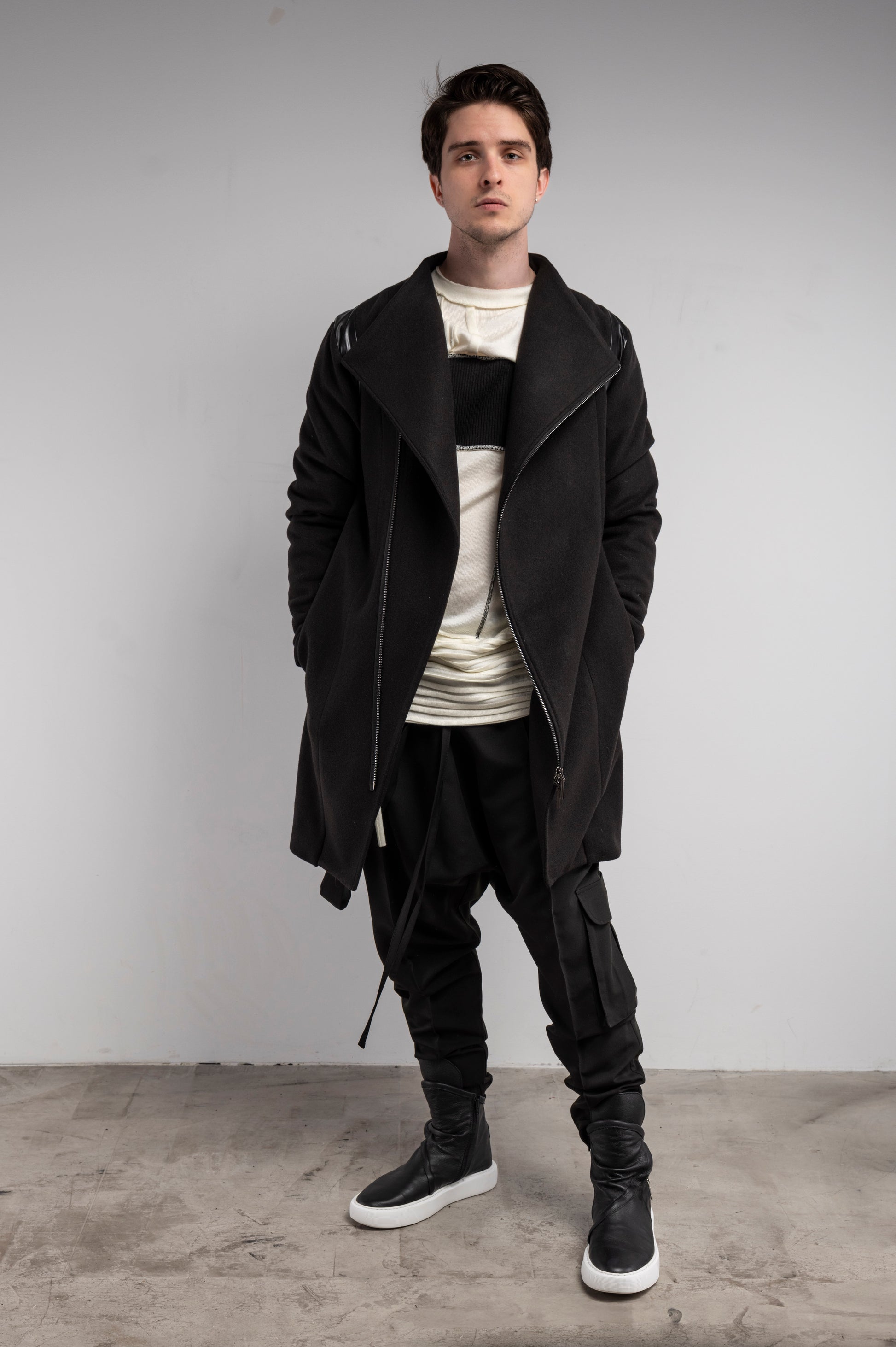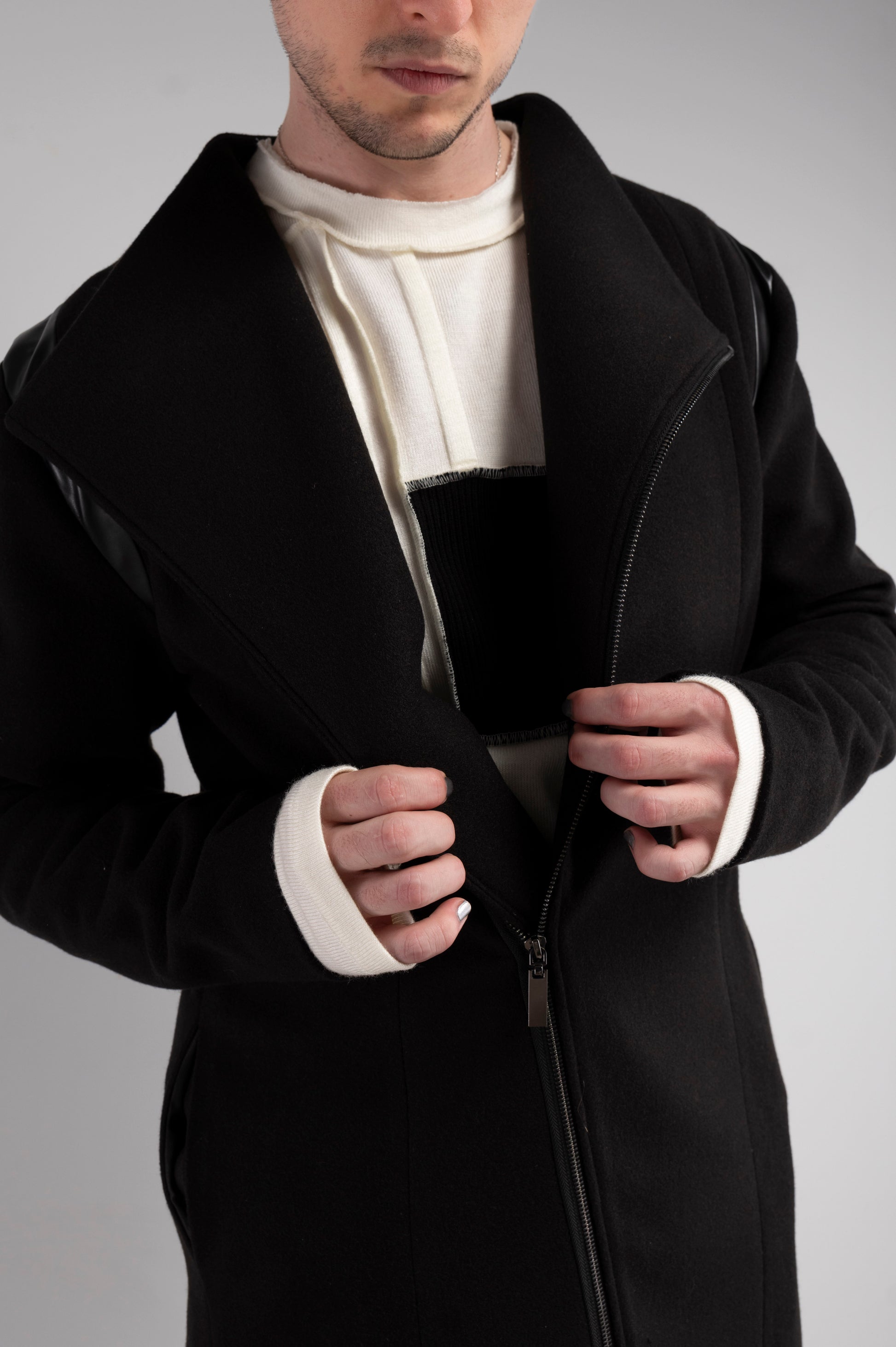 Men's cut peacoat with vegan leather shoulder detail, and pockets.