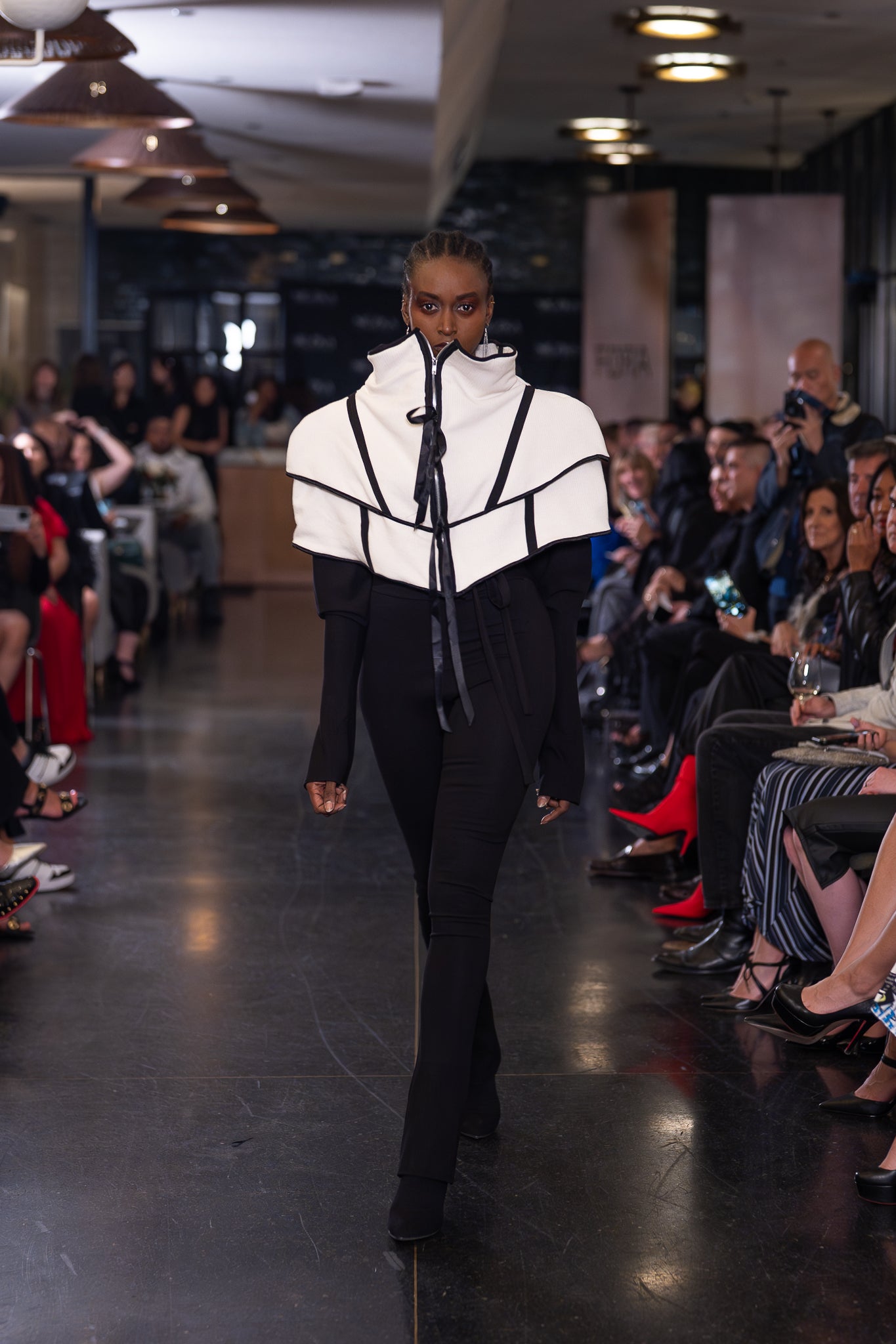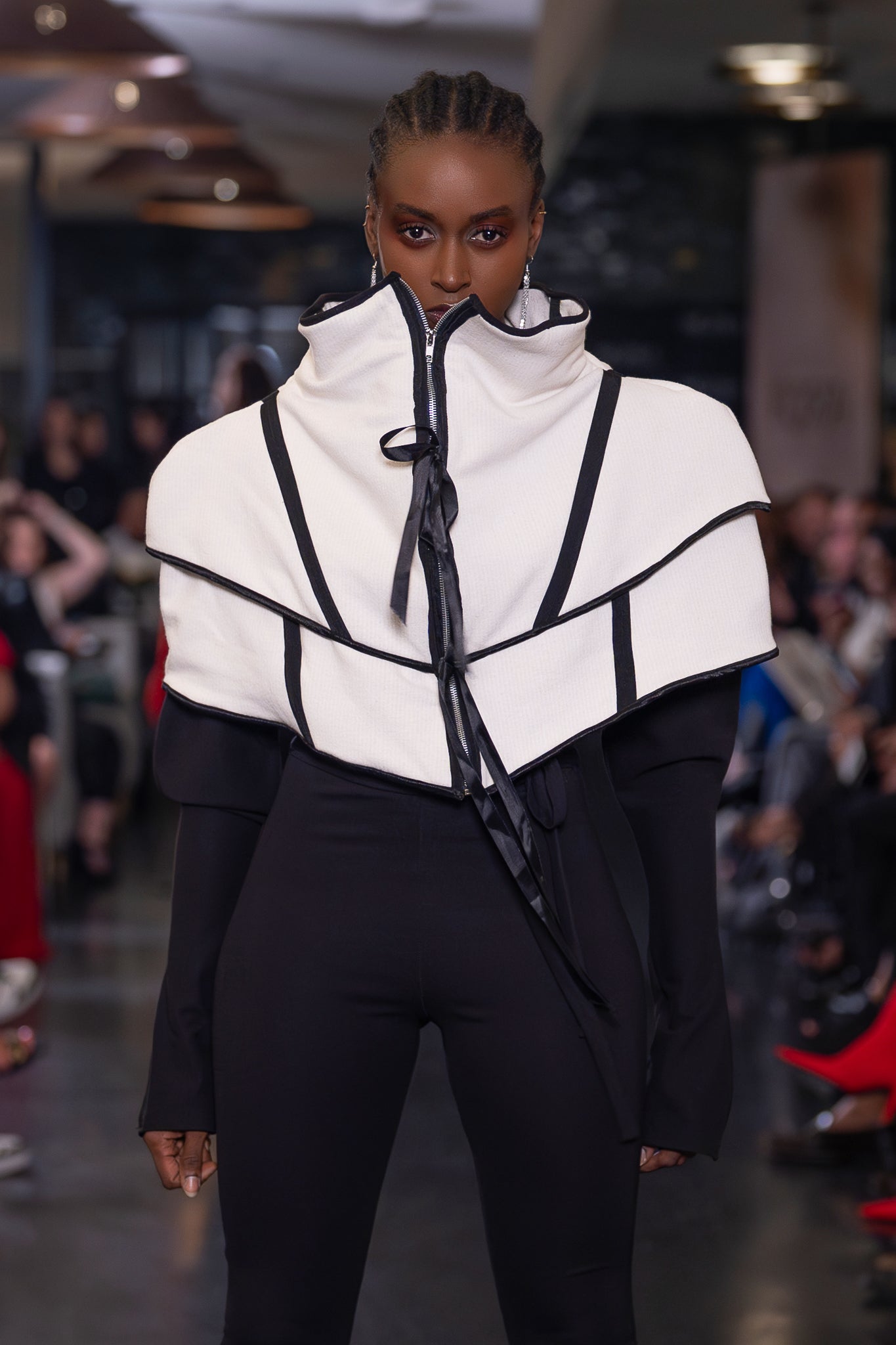 Avant-garde structured shrug with draped bows. Features black contrast paneling and a front zipper closure.