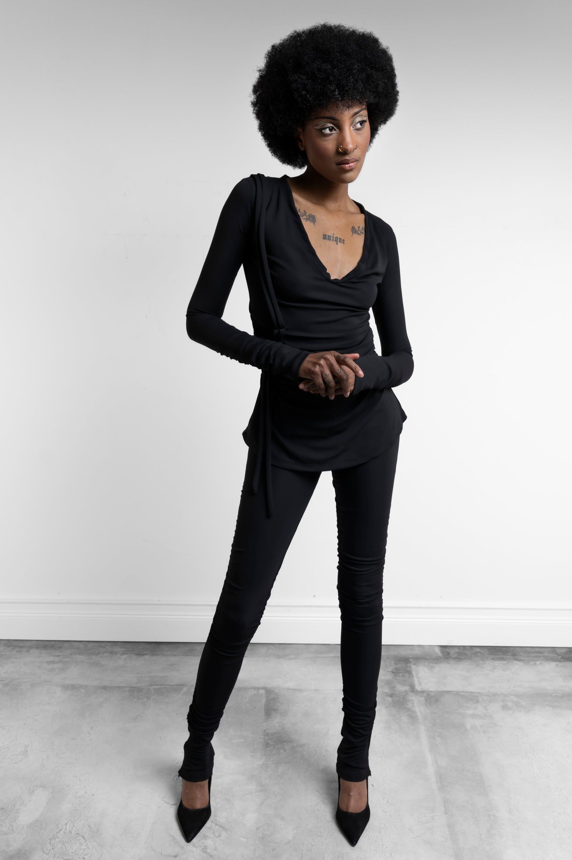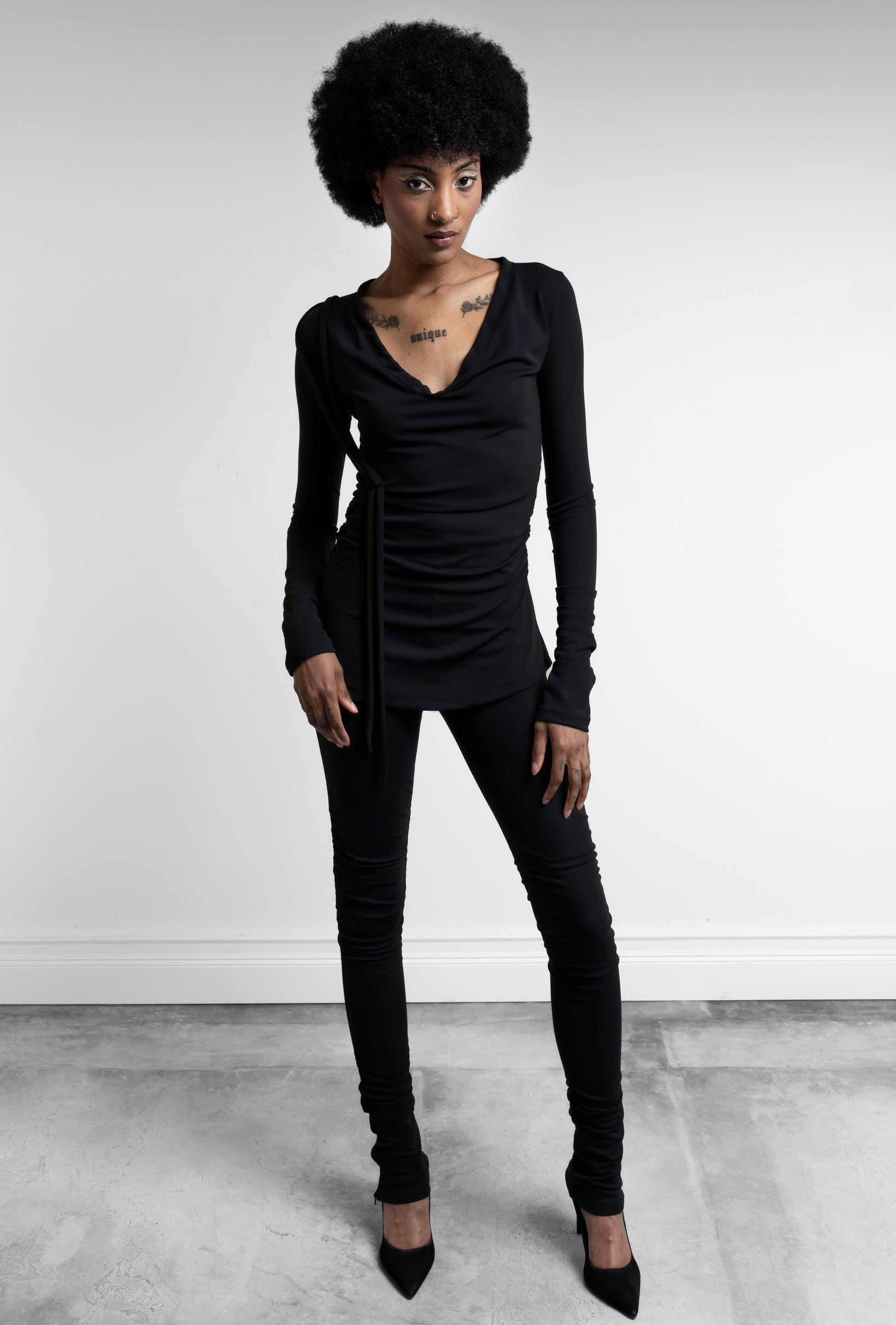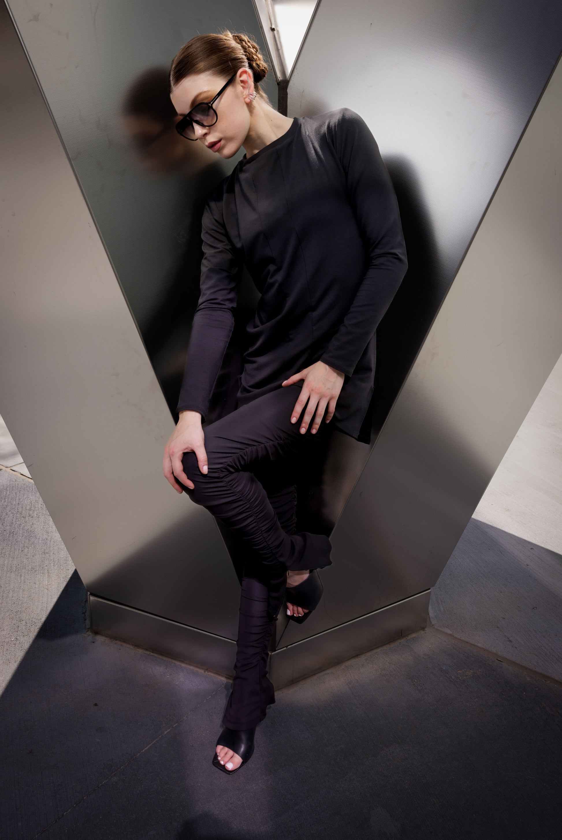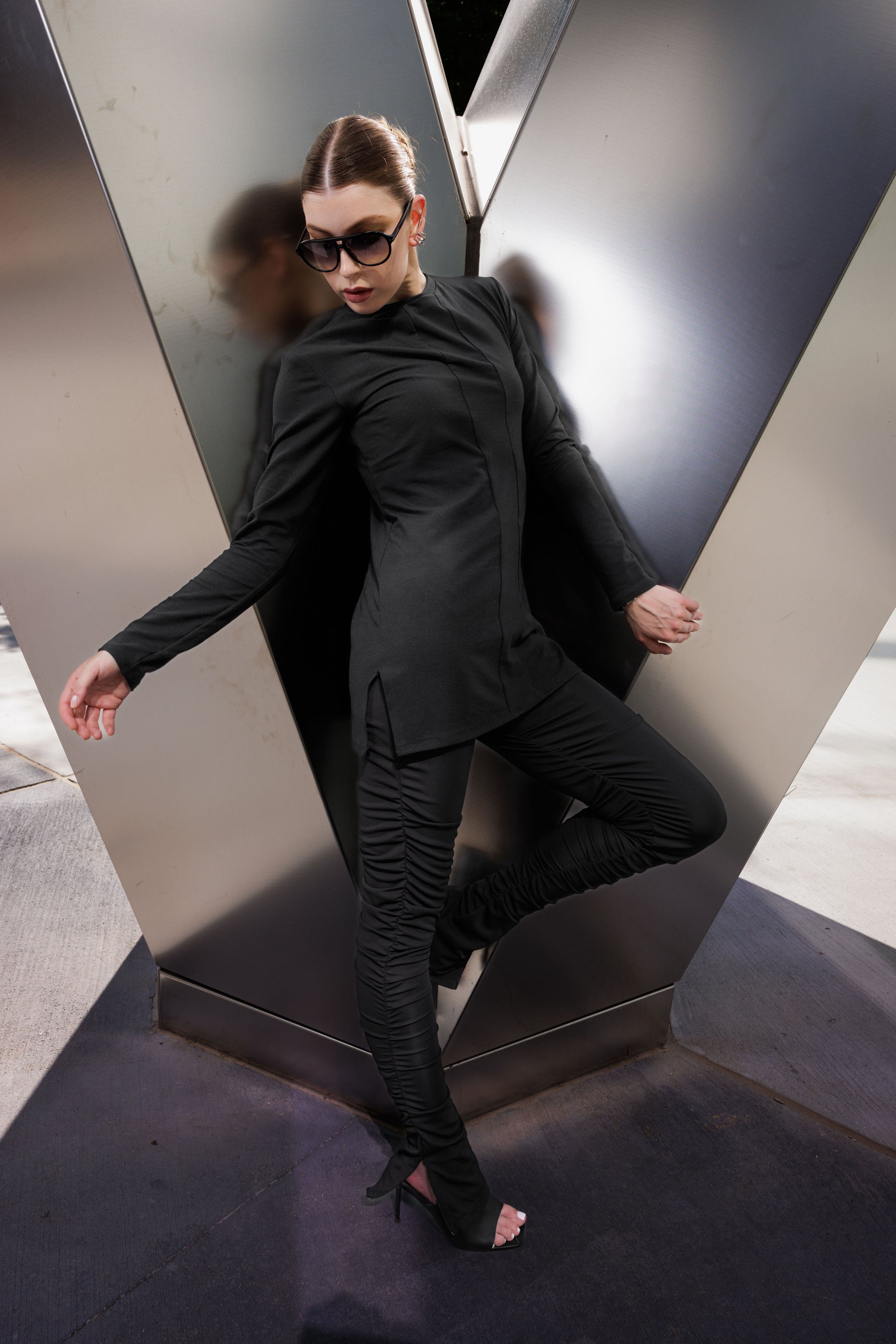 Elongating scrunched pants, butter fabric, slit at bottom side hem, 2” waistband, and metal zipper. Great for everyday.